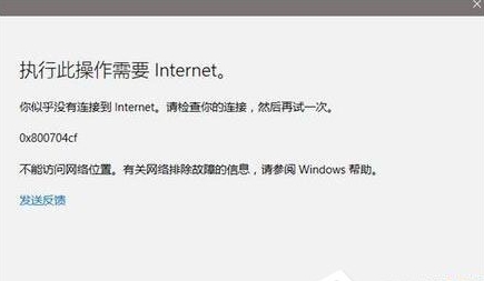 最近一位Win10用户遇到一个很棘手的问题,就是Wndows相关应用都打不开了,比如应用商店、Xbox、反馈中心等,只要一运行这些程序,系统就会提示“执行此操作需要internet,错误代码0x800704cf”,这是怎么回事呢?出现此故障一般是网络的问题,大家首先尝试更换网络,如若问题依旧,再按以下方法进行修复。