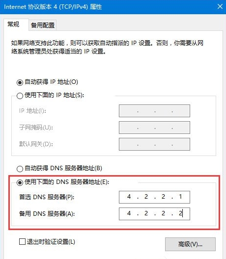 5、点击【使用下面的DNS服务器地址】,然后依次填入:4.2.2.1, 4.2.2.2 点击【确定】 -- 【确定】保存设置即可!