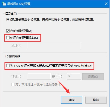 3、在局域网设置界面将 【使用自动配置脚本】、【为lan使用代理服务器】的勾去掉,点击确定- 确定 保存设置。
