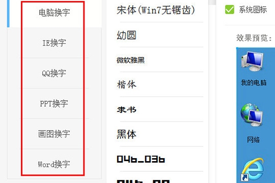 3、首先是“电脑换字”,电脑默认的字体为“宋体”,可以通过下拉找到自己需要的字体,点击想更换的字体即可,可以在效果预览中看到当前选择的字体与字体效果,并根据自己的需要是否勾选替换系统图标、系统标题与系统菜单,最后点击下方的“应用”即可。