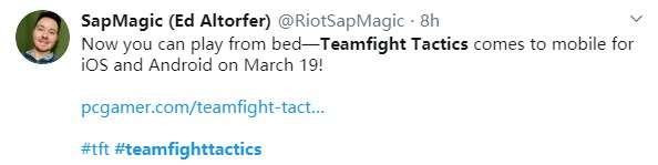 《云顶之弈》的设计师 Ed Altorfer 也在自己的 Twitter 上确认了这一消息,各位来自《云顶之弈》的棋友们马上就可以在床上躺着与众位高手们一较高低了。