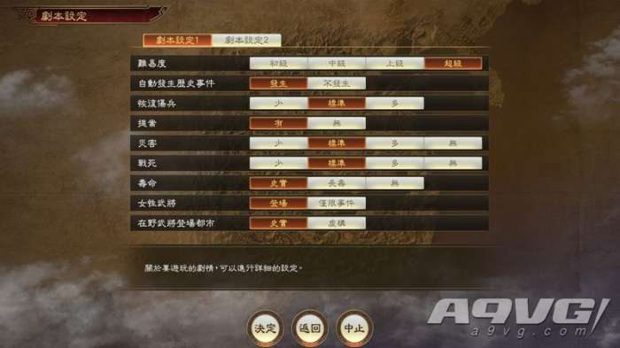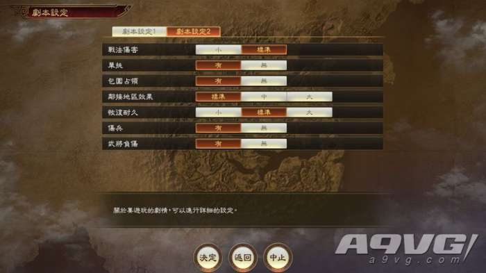 而「剧本设定」则将可以自由编辑设定各项改变游戏体验的项目,如战法的伤害值、 单挑、包围佔领、是否有伤兵、耐久的回復量等。因此将可以按照玩家自己喜好享 受游玩的乐趣,即使是同个剧本,按照「剧本设定」的编辑差异,游玩方式也将会 天差地远。