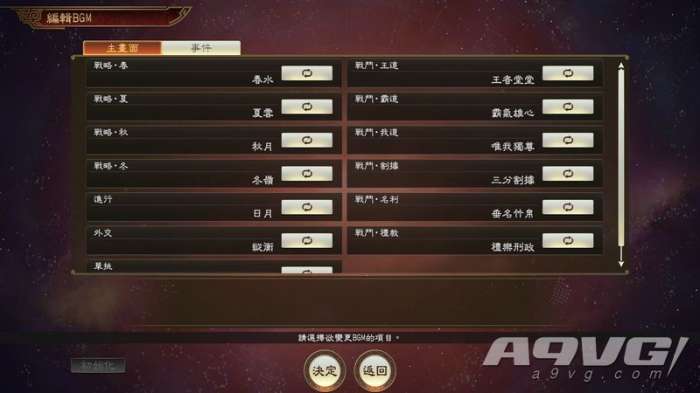「BGM 编辑&追加 BGM 组合」中除『三国志 14』的 BGM 以外,还将追加『三国志 12』与『三国志 13』的 BGM,全部共 88 首乐曲将可由玩家在游戏内依照情境与喜 好进行自由编辑,使『三国志 14』的游玩体验更加深入。