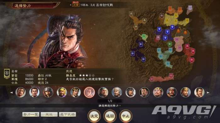 剧本「吕布讨伐战」是以 198 年 3 月为舞台的史实剧本,吕布与僭称帝位的袁术联 手,与已取得刘备协助、前来讨伐吕布的曹操一决雌雄。此外在河北则是袁绍与公 孙瓒的激战即将迎来最终决战的时刻。在本剧本中,由于曹操、吕布、袁术、孙策、 袁绍与公孙瓒等中等规模的势力维持割据的关係,因此无论使用哪个势力都拥有获 胜的机会。