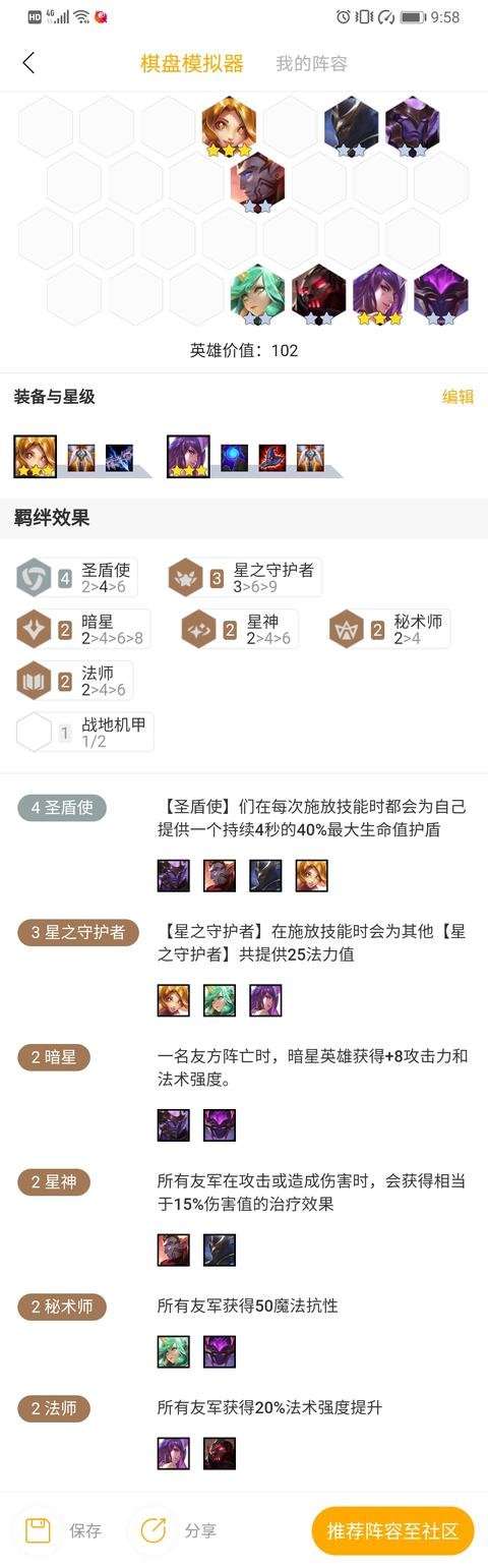一代版本一代神,版本的改动让我们很清楚的看到了设计师的意图.辛德拉的蓝量过少,确实不需要6星守,圣盾扎实的前排坦度和控制和星神的吸血能力为辛德拉的大杀特杀提供了充分的条件.趁着知道的人还不多快拿这套阵容去上分吧!