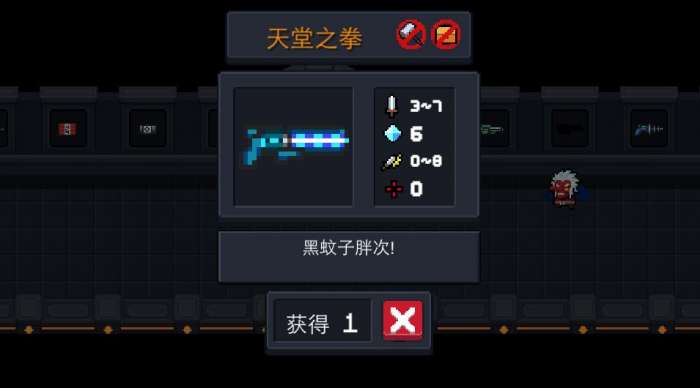 天堂之拳,无法获得宝箱,无法重铸获得,由骑士之拳和闪电法杖合成,橙武,攻击为蓄力攻击,攻击时撞到怪会分裂6~8个相对小的球弹弹在房间一次(还可再分裂一次),耗蓝为5(或者6)。