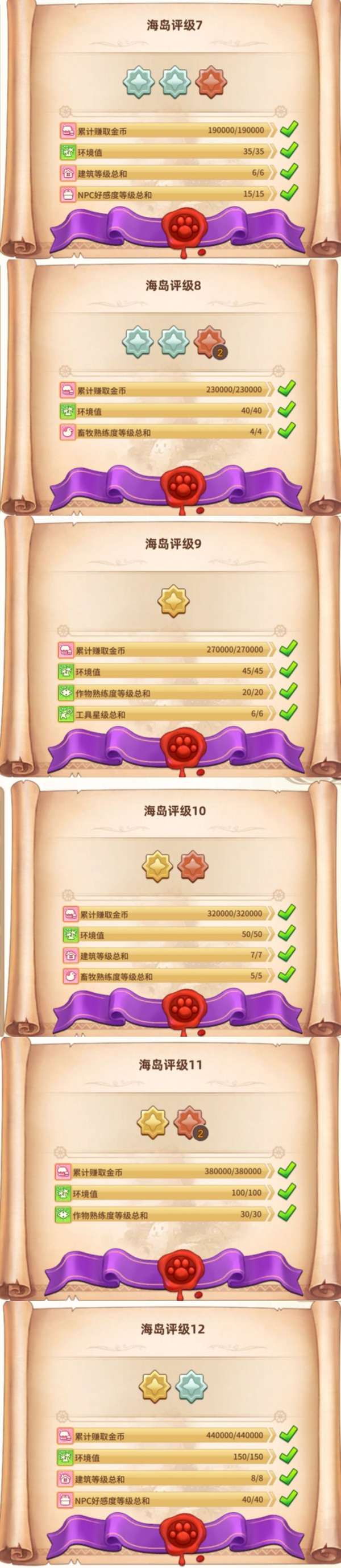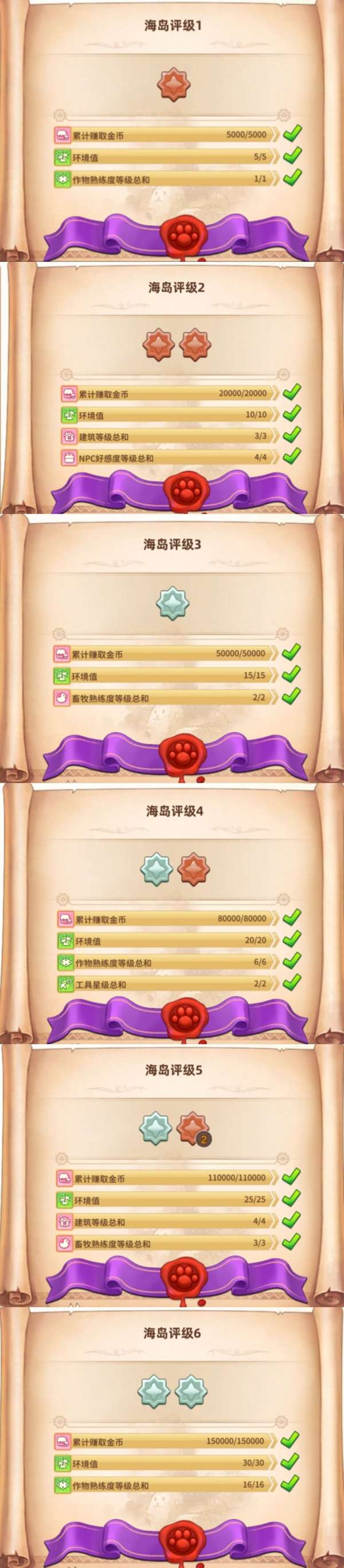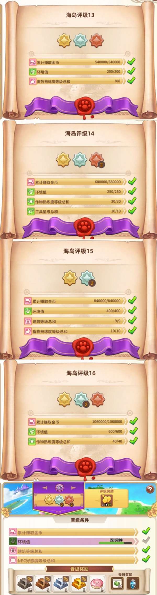 海岛评级收益:大量升星材料,珍珠和甜甜圈,评级越高,每次送配送订单都能额外增加动物好感度。