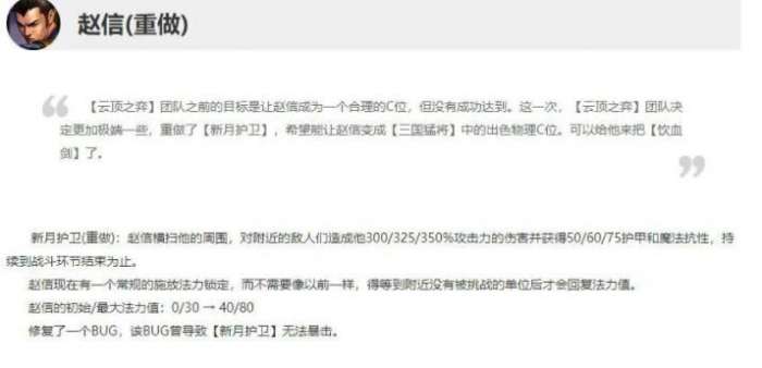 10.23版本中,重做归来的赵信输出能力有了较大的提升,虽然蓝量增加但是赵信的持续输出能力将会有更大的起色。首件做出饮血剑能够大幅度提升赵信的输出伤害,同时让赵信在技能释放期间利用被动效果大量偷取生命值来提升他的持续战斗能力。第二件选择水银可以防止赵信被控制技能限制住,有了水银能够让赵信稳定的释放技能来打出输出并为赵信提供强大的抗性加成,同时持续不断利用饮血剑的效果为自身回复生命值。第三件让天神之剑,由于版本中天神羁绊获得了增强,让赵信转天神羁绊可以获更高的额外真实伤害与减伤效果。