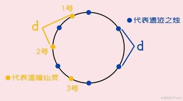 如下图所示,可以视每两个遗迹之烛(蓝色圆点)之间的距离为d,则遗迹之烛构成的圆周长为6d,3个仙灵(橙色圆点)分别位于两个遗迹之烛的正中间,则3个仙灵两两之间的初始距离也为d,编号与上图一致。