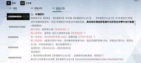 指挥官可在【研发】-【年禧密约】中兑换【年禧密约认证卡】,【年禧密约认证卡】为“年禧密约”研发池中专属研发货币,可在“年禧密约”研发池中抽取奖励,具体规则请指挥官届时在研发池详情中进行查看