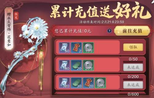 累计充值赢好礼!2月1日停服维护更新后-2月21日24点,充值达到指定金额,即可领取精美背饰、限定头像框、气泡框和实用道具等档位奖励~背饰:花意如、头像框:牛柿迎春、气泡框:牛柿呈虹……更有江湖笺、天涯令·四等游戏道具奖励噢!功力、魅力两手抓!