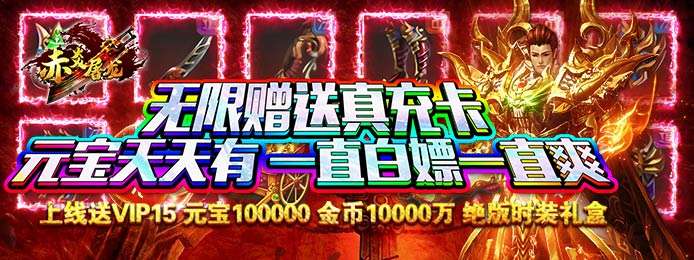 赤炎屠龙(无限送真充)是一款承载着无数80后传奇记忆的三角色挂机类游戏上线送vip15,万元充值卡登陆就送,更有每日登录领取真充卡,零元党也可以玩的很开心!游戏不但还原了经典的传奇特色,更加入了一些创新元素!让您和您的那些兄弟驰骋沙城,称霸全服!