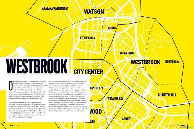 威斯布鲁克是夜之城观光揽胜之地。 North Oak北橡树园是最为高档奢华的住宅区,堪称人间仙境, Charter Hill宪章山次之,乃是所有保有野心的中层企业员工的应许之地。日本街则是当之无愧的夜之城娱乐中心,游客和企业员工们追逐享受的地方。