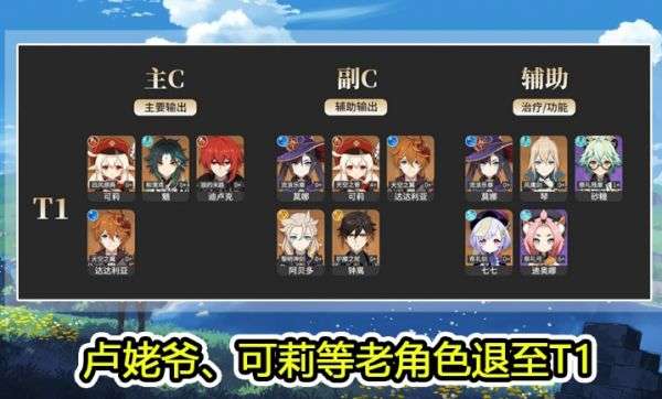 然后是T1级别的角色,大家可以看到,大部分老的五星角色都出现在了T1级别之中,包括可莉、卢姥爷、公子、琴团长等等。