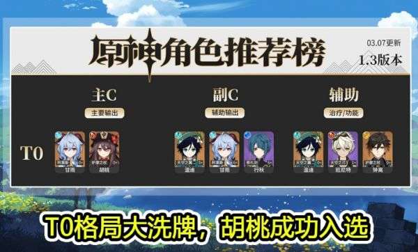 首先是T0级角色,主C变化很大,魈、公子、可莉和卢姥爷集体下线,甘雨和胡桃独占T0主C之列,而且只需要0命即可。