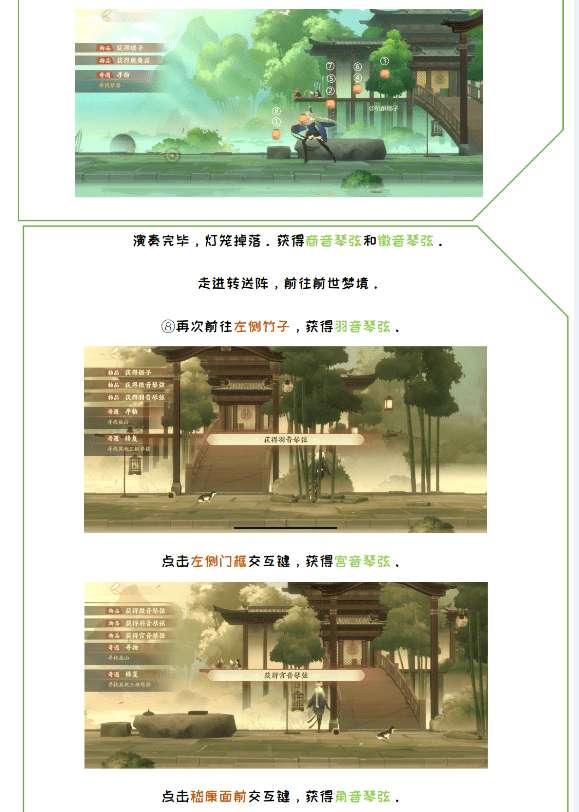 ⑥进入忘川,打开桌上的第二个盒子,一三二三五,获得喜之果。把喜之果喂给鸟,会唱第二首,顺序: 1-3-5-4-3-4-3-1获得商音和徵音琴弦,进入幻境,在嵇康面前的石块上获得琴弦,在拱桥左边的柱子那获得琴弦,在竹林获得最后一个琴弦。
