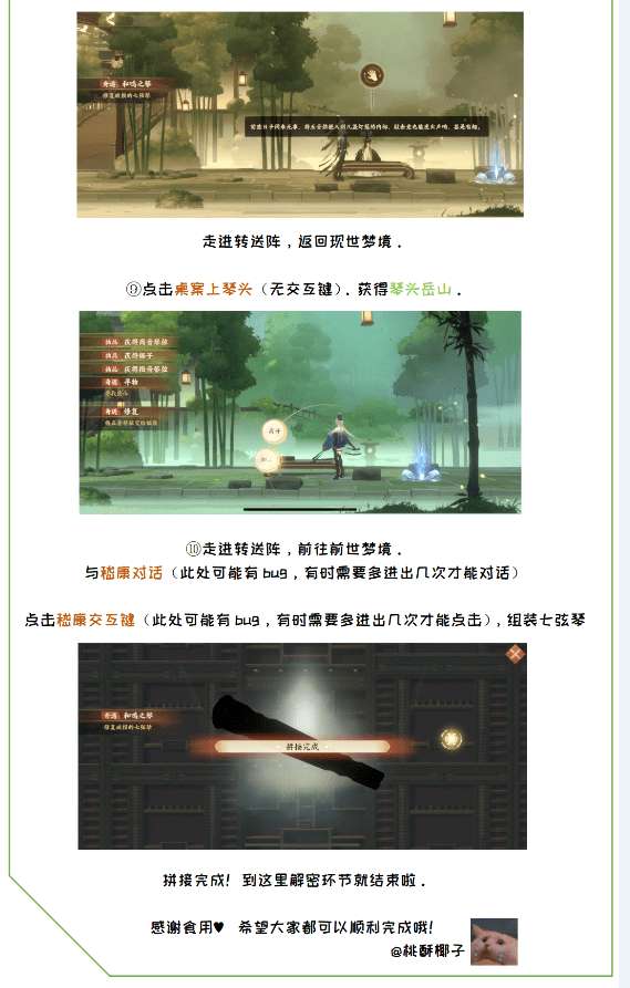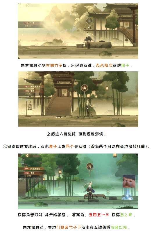 ④顺序:从左到右: 12345,5-1-2-4-2-1。在最左边灯笼处获得竹刀,中间泛红的罐子用来加鹿角霜,得到琴漆。进入幻境,把琴漆交给嵇康,他会让你去找琴徽。