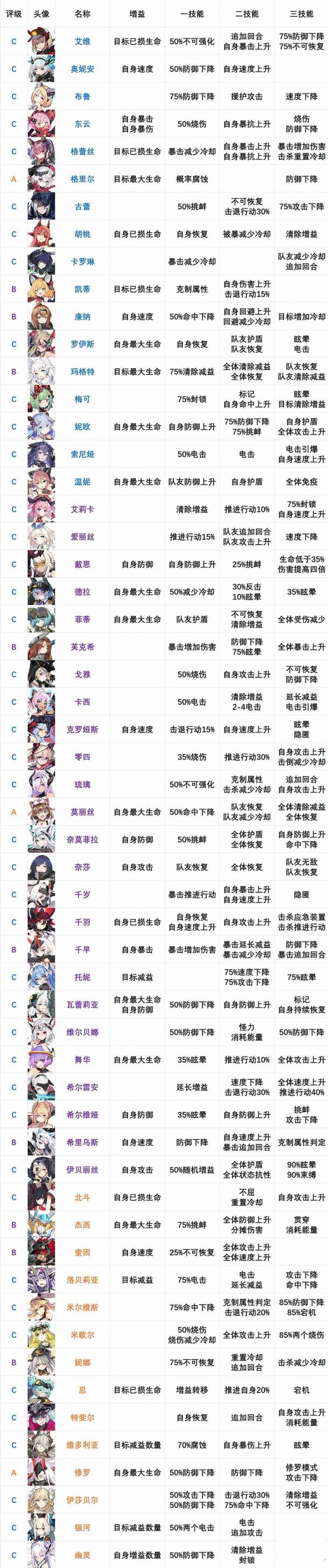 洛贝莉亚获得难度低,并且是所有dot队的核心之一,让她的价值叠加了上去。1技能伤害不是很高,但能附加电击让总输出提升了不少,2 技能是洛贝莉亚的绝对核心,抛开伤害来说,延长对方全体减益状态1回合,这里的减益状态指的是只要存在身上减益buff都算在内,这个技能让大部分队伍可以有更大的容错率。大招的全体双减益buff也非常优秀,只要buff挂上去,就算是脆皮也可以当T用,速度上升在洛贝莉亚有高额速度属性时让她能更快行动(非常有用,刷多一次2技能就能全程debuff挂上)。