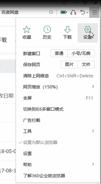 我们用360浏览器登陆网页版百度网盘,接着在浏览器右上方点击三个横杠的标志,选择设置。