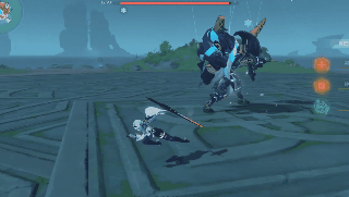 这个技能只会在第二阶段出现。剑鬼向后闪身,并在原地留下一个幻影进行连携攻击。如果留下的是风属性幻影,连携攻击会是向玩家方向的连续的风刃攻击,幻影会发射一道风刃,boss本体则发射3到4道风刃。这个技能可以通过绕着boss按住加速跑一个大圈来处理,大圈的半径与场地半径差不多即可。
