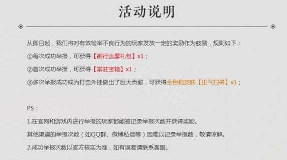 多次举报成功或为打击外挂做出了巨大贡献的玩家,可获得金色枪皮肤【正气扫帚】x1;另外,玩家每次成功举报,可获得【御行达摩礼包】×1 ;