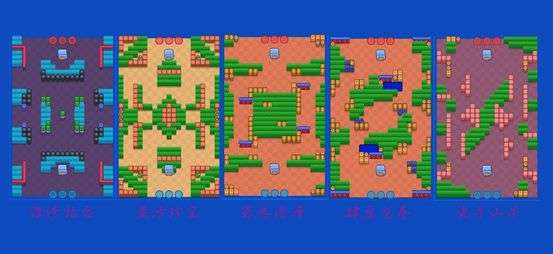 这张图脱胎于早期地图“恐怖隧道”,中部那一片不大但很长的草丛,是这两张地图的精髓。中远程英雄可以利用这片草丛尽情地攻击敌方的近战英雄喔。而金库边竖条状的小型掩体又为投掷英雄提供了输出空间。这张地图最为简单,基本上不分激战区和金库区。适当前压是很好的策略,特别推荐杰西,她能让你有机会攻击对方英雄的同时消耗金库,命中概率远大于其他地图,伤害效果max。