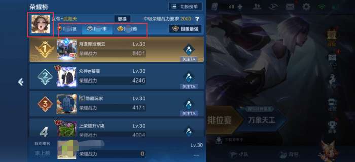 王者荣耀英雄怎么获得地区排名