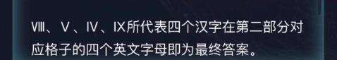 VI、V、V、IX所代表四个汉字在第二部分对应格子的四个英文字母即为最终答案。