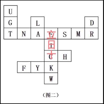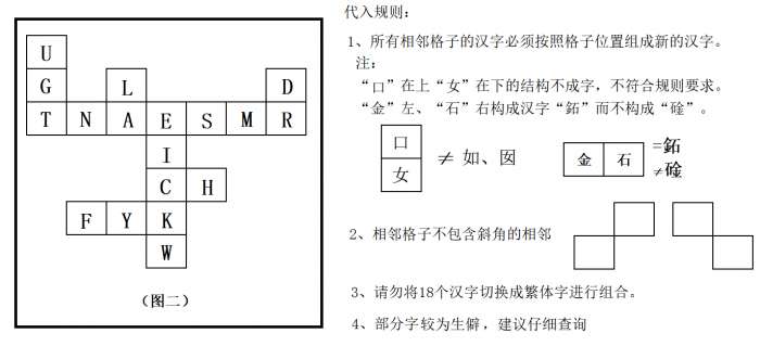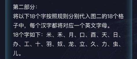 第二部分:将以下18个字按照规则分别代入图二的18个格子中,每个汉字都将对应一个英文字母。