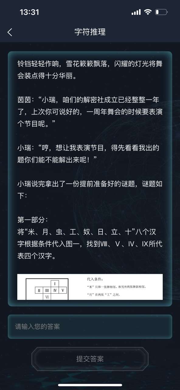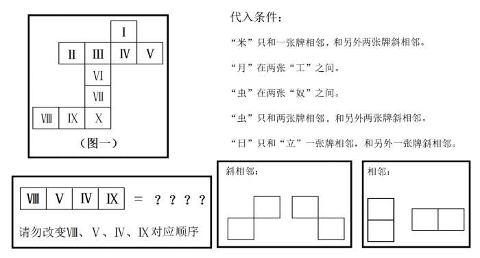 第一部分:将"米、月、虫、工、奴、日、立、十"八个汉字根据条件代入图一,找到VⅧ、V、IⅣ、X所代表四个汉字。