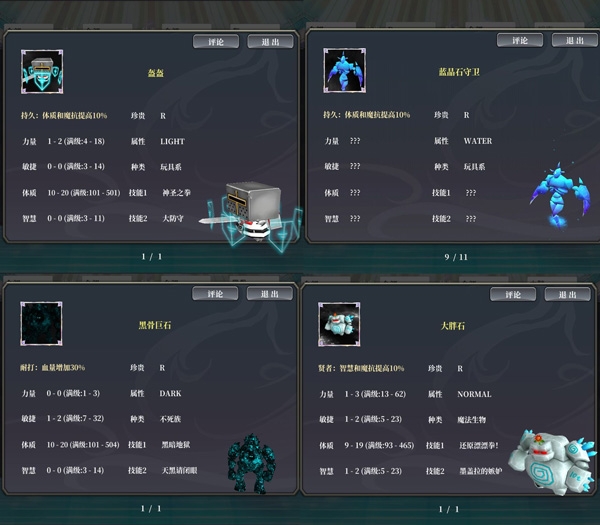 思来想去我还是没法把这几位分个高下!盔盔和黑骨巨石两者的体质绿字差不多,都是500左右,两者的种族天赋又不相上下,一个是体质和魔抗提升10%,一个是血量提升30%,对于守卫来说作用都挺大,蓝晶石无论成长或者是天赋都和盔盔差不多,不多加赘述;而大胖石的种族天赋稍弱了一些,虽然有10%魔抗,但守卫以体质为主,提升智慧可以无视,不过大胖石有一个隐藏被动“遗迹的守护”,残血时能够回复一次50%的生命值,这个被动给他加分不少。因此所以我将他们并排为第二名。