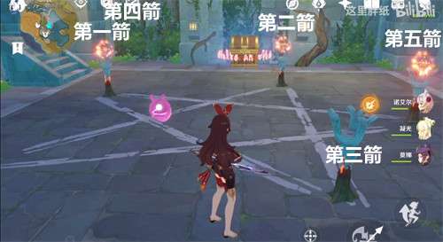 我们第一阶段的目标就是场上只亮一个火把,最后射击与它对应两角的火把即可!