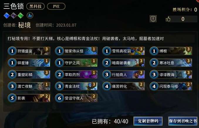 总而言之,三色锁就是锁住对面的怪,让对方无法攻击,自己再使劲撕对面的牌,使对面牌库的牌为0,当对面没牌时自己就赢了 ~最后注意这套卡只能打秘境,打天梯会被打的找不到北~