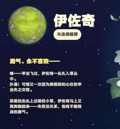 他的性格中也会藏着一些执着和勇气,独具标志性的行为,那就是一直追逐昆虫。每当甲虫飞过之后,它总是会直接扎进草丛中,不会有任何的犹豫。但却因为奔跑而摔倒,最终和喜欢的昆虫失之交臂。即便如此,也并没有沮丧,只是笑着将头上的小草拍掉,然后又立刻爬起来追逐,还会元气满满的说道,没关系,这次没抓到,下次就会有惊喜。这一种永不言败的精神,也会感染着每一个不一样的玩家。