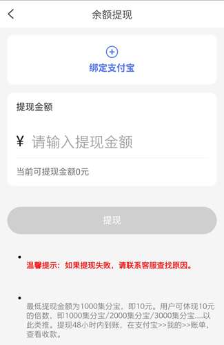 100集分宝就等于1元钱,可以提取到支付宝当支付宝的余额花,不过不是现金,现金余额需要10元提现。需要绑定支付宝才可以提现,通过输入姓名、支付宝账号验证手机号,才可以完成绑定并且提现。