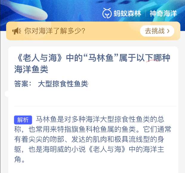 1、题目:《老人与海》中的“马林鱼”属于以下哪种海洋鱼类