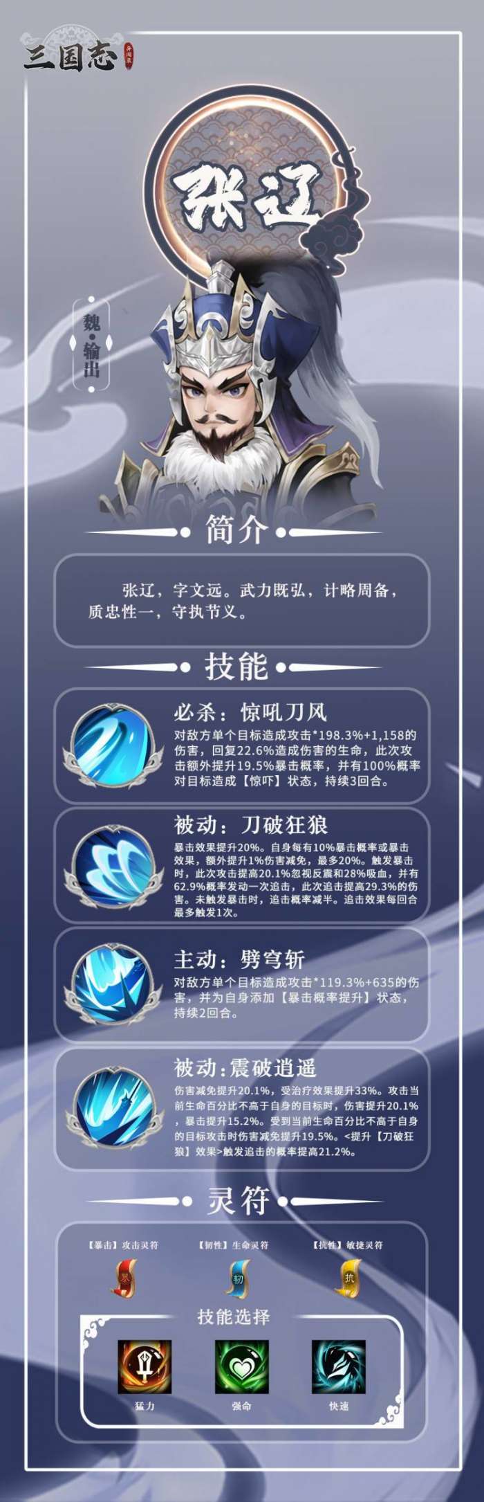 【定位】张辽是拥有强大伤害能力的输出型武将,普通技能进行单点并提高自己暴击能力,必杀略微控制对方并造成大量伤害,同时给自己回血。