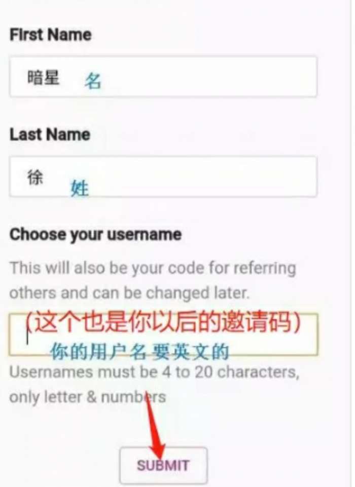 用户名(Choose your usename)建议取英文,这个同时也是你的个人邀请码,在你邀请他人时让他们填写