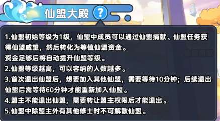 3、首次退出仙盟后,想要加入其他仙盟,需要等待10分钟;后续退出仙盟后需等待60分钟才能重新加入仙盟。