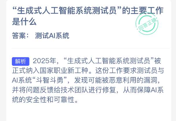 “生成式人工智能系统测试员”的主要工作是什么?【蚂蚁新村每日一题】2026年2月12日题目已发布!坚持答题,积累木兰币,即可加速小镇建设。答对本题,立即可享“产速+3/时”的加速奖励!今天正确答案是【测试AI系统】。“生成式人工智能系统测试员”的主要工作是测试AI系统.