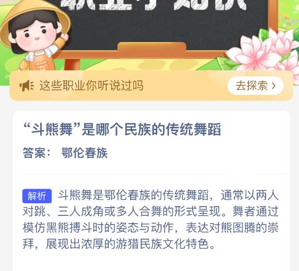 “斗熊舞”是哪个民族的传统舞蹈?【蚂蚁新村每日一题】2026年3月24日题目新鲜上线啦!今日答案是:【鄂伦春族】。每日坚持答题,不仅能积累木兰币为小镇建设添砖加瓦,更有惊喜奖励等你来拿。只要答对今日题目,即可立即享受“产速+3/时”的加速福利,让你建设小镇的步伐更快一步。