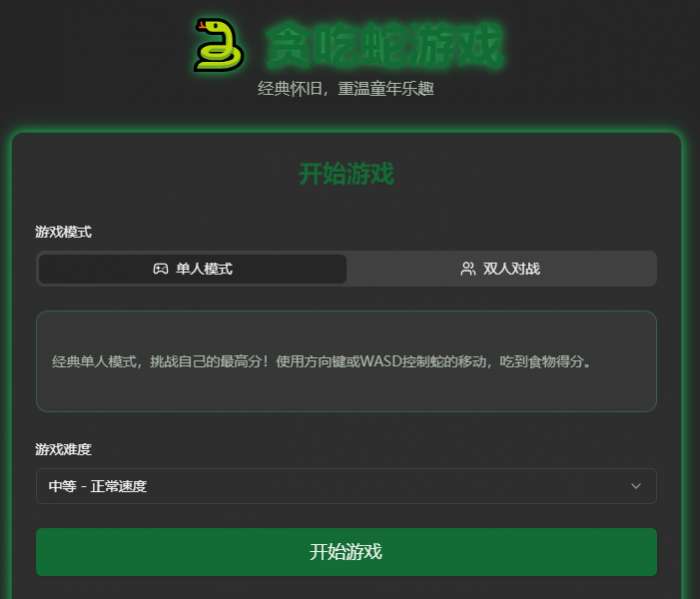 贪吃蛇网页版即玩入口:点击链接1可选择单人或双人模式及难度,登录后可保存游戏记录,页面顶部可查看排行榜与规则;点击链接2输入昵称即可开始游戏。无需下载,在线畅玩。