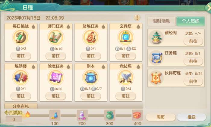 日程界面可以让各位少侠了解到,每天可以参加的任务和活动有哪些?