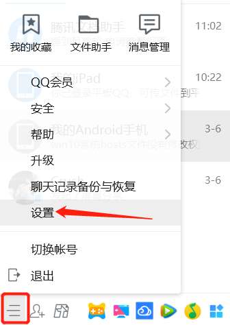 然后打开qq,点击界面的左下角的三个杠标志,选择设置。