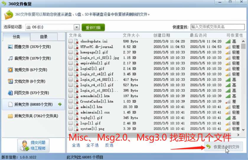 在列表中找到这几个文件(Misc、Msg2.0、Msg3.0)勾选之后,点击右下角的恢复选中的文件。