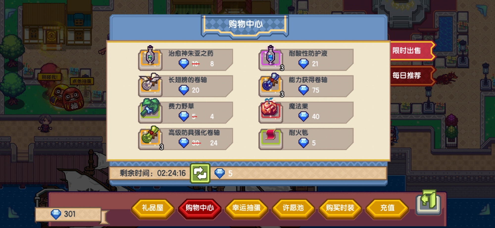 水妖比较推荐冒险者们在商城的购物中心购买药草,三颗药草一共15钻石!