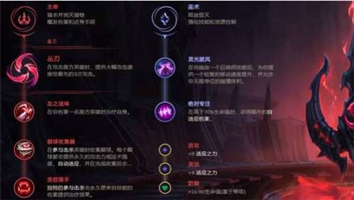 丛刃可以在攻击到敌人的时候快速提升大幅度攻速给到前三次攻击,血之滋味和贪欲猎手双吸增加续航,眼球收集器增加适应力,灵光披风,释放召唤师技能后的的带移速加成,绝对专注生命值高于70%获得适应力加成。