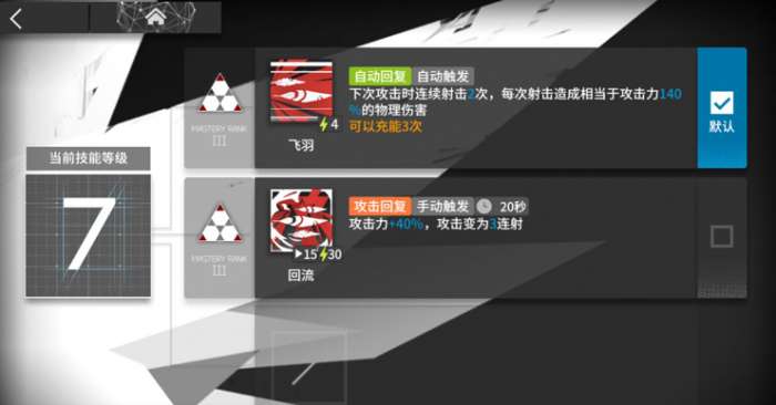 灰喉两个技能均为标准模板,但以为一技能可以充能的缘故倍率较同种技能略低。但可充能这点是不能忽视的,充能三次的灰喉可以通过爆发迅速解决第六章的寒霜飞机,可以为友方提供更好的输出环境。