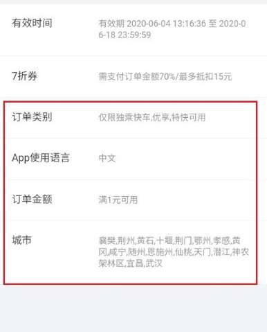 第五步进去之后,可以看到优惠券的有效时间,优惠金额,使用的类别,城市,点击立即使用,可以进行使用优惠券,支付的时候,会自动进行抵扣,如下图所示: