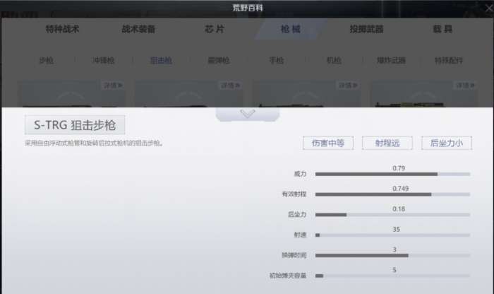 S-TRG狙击步枪伤害力与毛瑟相当,射程较远,后坐力小,换弹时间较短,各性能数值较平均,也是一把适合新手的狙击枪。S-TRG的性能优于毛瑟,不过刷新率略低,科技感十足,还可以一枪撂倒满血2级头。